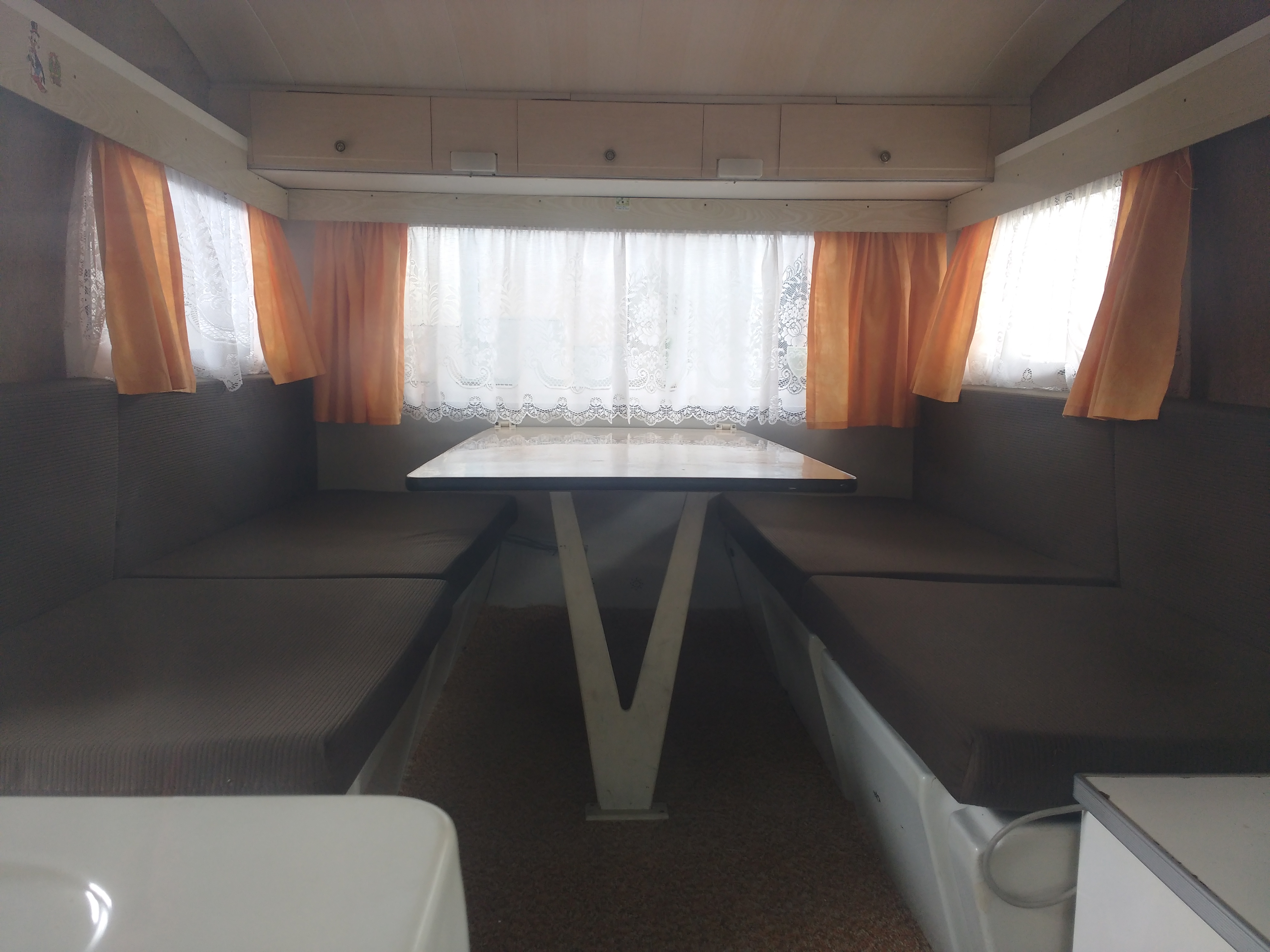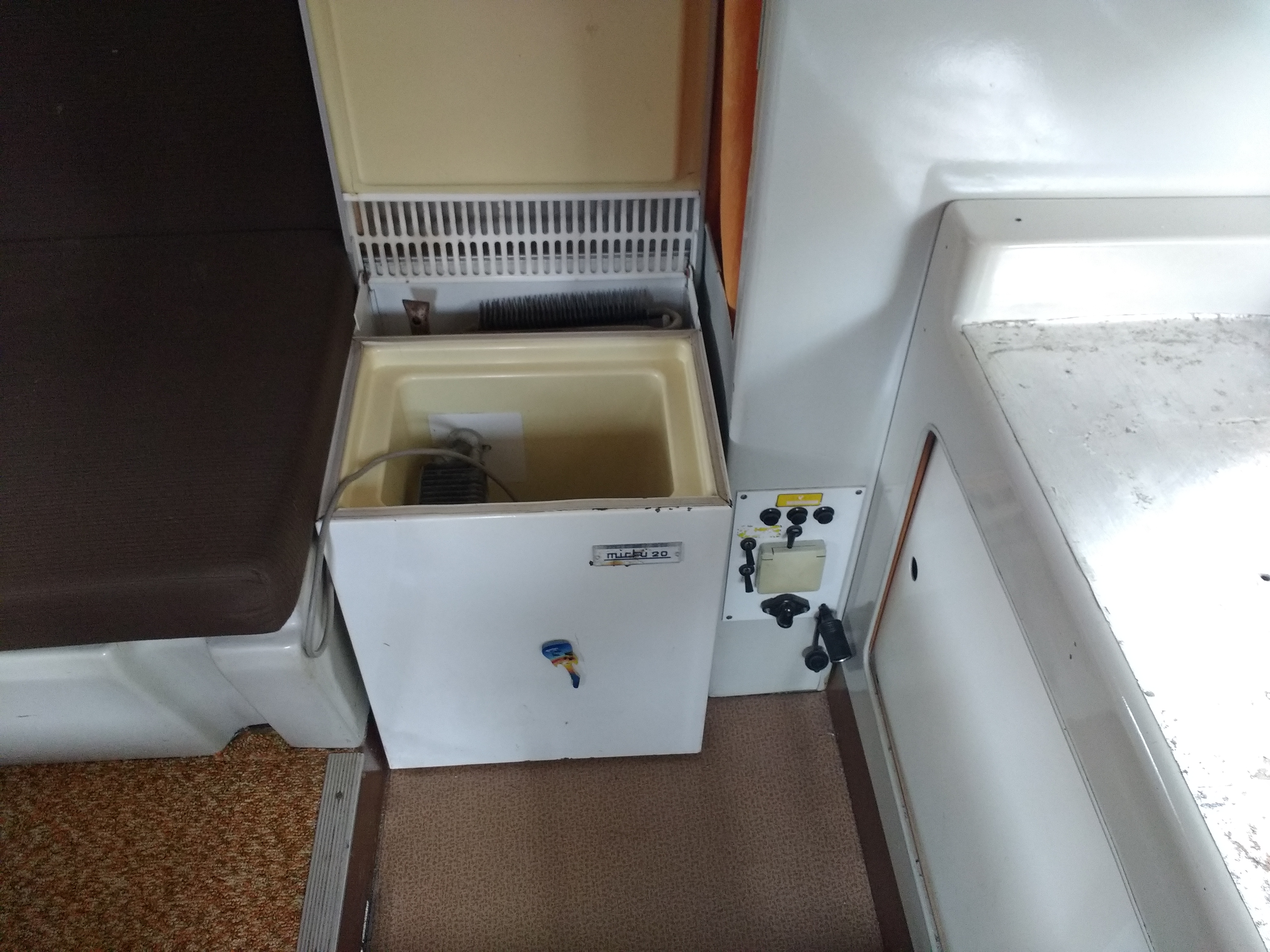 | Ein Waschbecken mit Wasserhahn im Frontbereich rechts 2 große Stauräume gibt es unter der Sitzfläche.